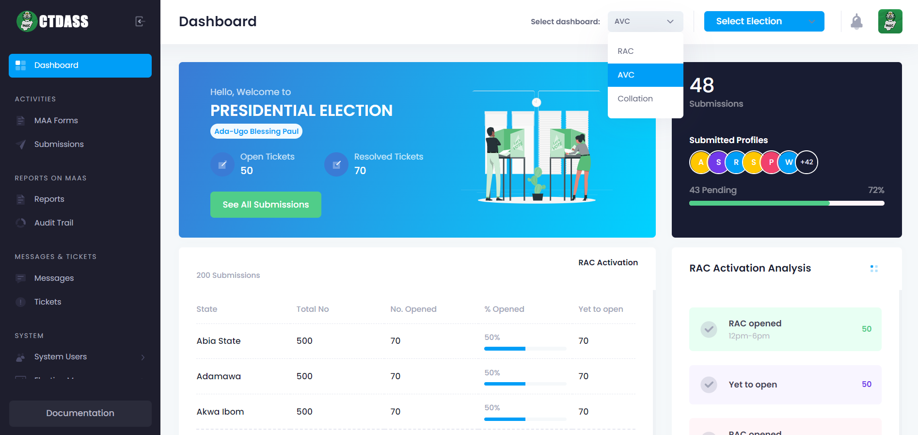 With CTDASS, you could easily switch from one election activity dashboard to the other, view Real time reports and data from that particular activity