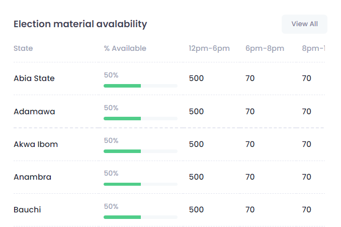 - Election Materials Avalability (State,Percentage and Amount available, Time slots. )